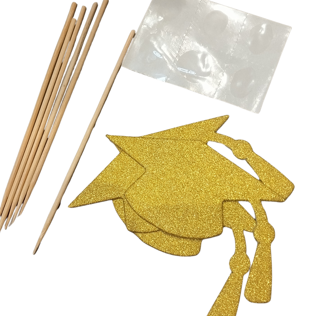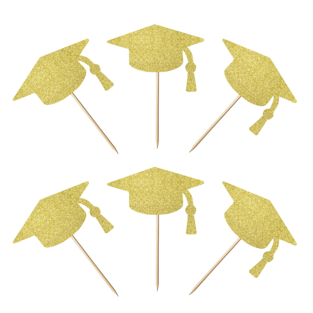 Pack de toppers con forma de Birrete de graduación glitter dorado.